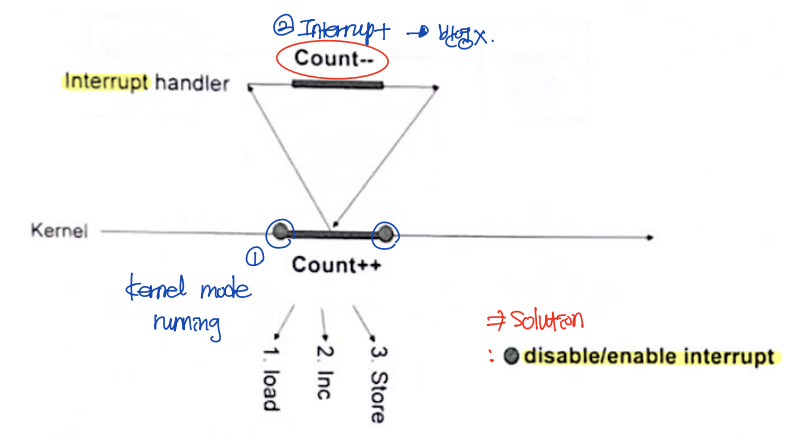 - Solution: kernel mode 수행 시, interrupt disable