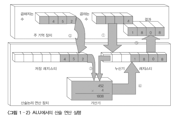 캐시/메모리로부터 읽어 온 데이터는 레지스터(Register)라는 CPU 전용의 기억 장소에 저장되면, ALU는 레지스터에 저장된 데이터를 이용하여 덧셈, 곱셈 등과 같은 산술 연산을 수행한다.