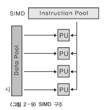 - 다수의 ALU는 모두 하나의 제어장치에 의해 통제되고, 명령어 실행과정에서 서로 다른 데이터를 이용한다.