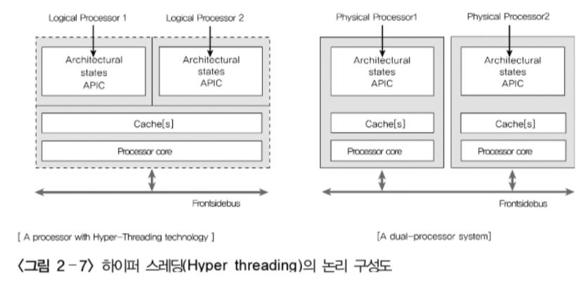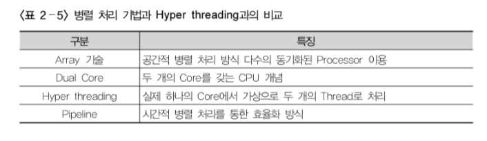 - 하이퍼 스레딩(Hyper threading): 하나의 CPU 내에서 두 개의 CPU처럼 처리하는 가상 기술