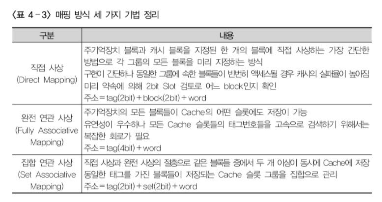 캐시 메모리는 실제 메인 메모리에 비해 그 크기가 매우 작아서, 메인 메모리와 1:1 매칭되는 동일한 주소 체계를 가질 수 없다. 그래서 메인 메모리와 다른 형태의 주소 매핑 방식을 사용하고 있다.