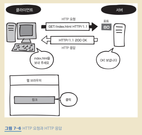- 웹 브라우저에서는 HTTP 요청을 보내고, 웹 서버에서는 HTTP 응답을 반환한다.
