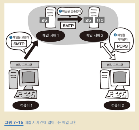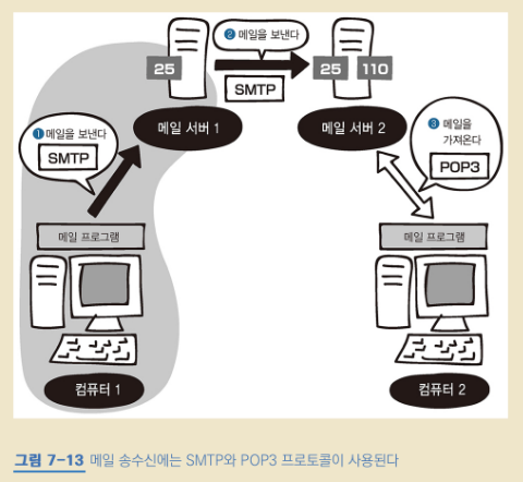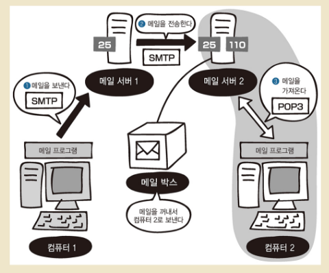 - 컴퓨터1의 메일 프로그램은 SMTP를 사용하여 메일 서버1로 메일을 보낸다.