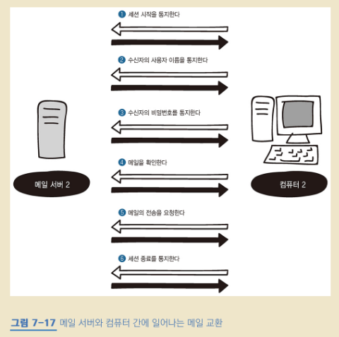 ** 메일 서버2에 컴퓨터1의 메일이 도착하면, 컴퓨터2는 메일 서버2의 메일 박스에 있는 메일을 받아 가야 하지만, 메일을 수신할 때는 사용자 이름과 비밀번호를 이용한 사용자 인증이 필요하다.