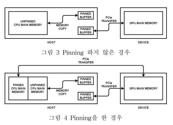 그래서 본문에서는 두 번째 기법을 기반으로 데이터 전송 방식을 향상시키고자 한다. 먼저 모든 호스트 주 메모리상에 존재하고 디바아스가 사용할 데이터를 모두 pinning하고, 시스템에서 가용 메모리 부족으로 페이지 폴트가 많이 발생한다면, 백그라운드에서 동작하는 데몬을 통해 자동으로 pinning을 해제하는 방식을 사용할 것이다.