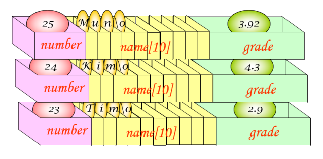 - 구조체: 서로 다른 타입의 변수들을 묶는다.