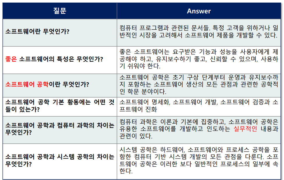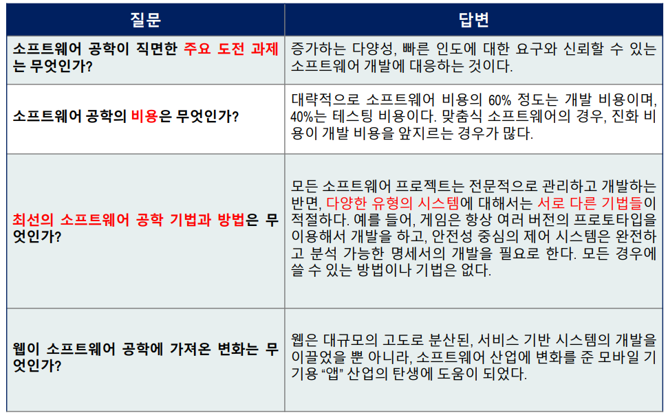 - 소프트웨어 공학은 고품질 소프트웨어 시스템의 비용 효율적인 개발에 중점을 둔 학문 분야이다.