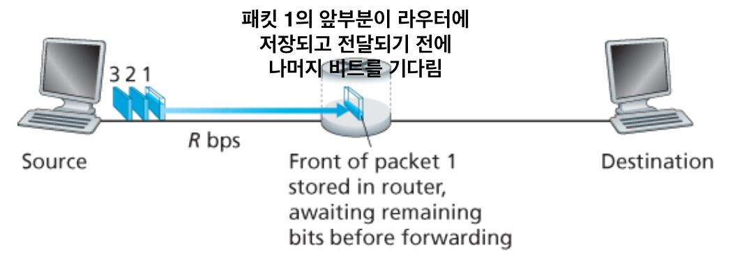 저장-후-전달은 스위치가 출력 링크로 패킷의 첫 비트를 전송하기 전에 전체 패킷을 받아야 함을 의미한다.
