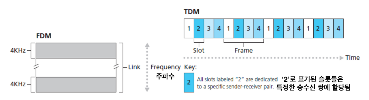 : FDM에서 링크를 통해 설정된 연결은 그 링크의 주파수 스펙트럼을 공유한다. 특히 그 링크는 연결되는 동안 각 연결에 대해 주파수 대역(bandwidth)을 고정 제공한다.