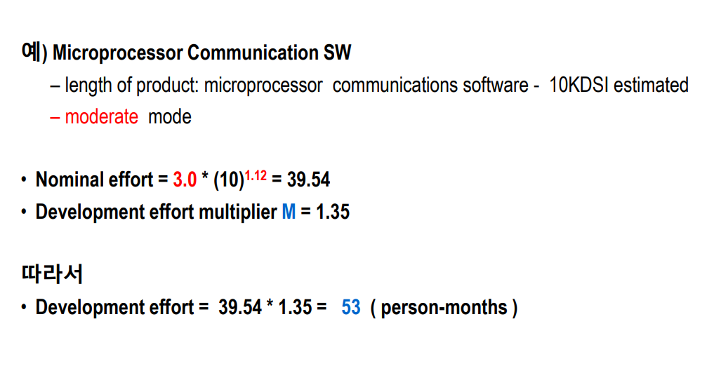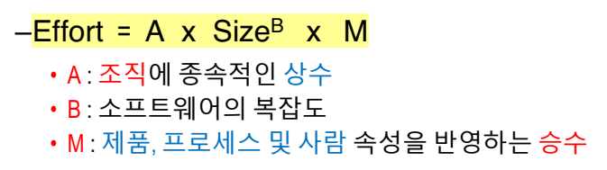 : 프로젝트 크기의 추정치, 개발되는 소프트웨어의 유형, 다른 팀, 프로세스, 제품 요인들을 근거로 하는 수학적 공식을 사용한다.