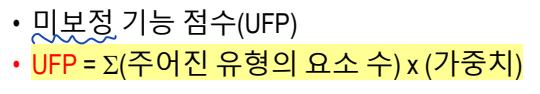 --> 미보정 기능 점수(UFP): 각 유형의 요소에 가중치를 곱하고, 모든 값을 합산하여 계산한다.