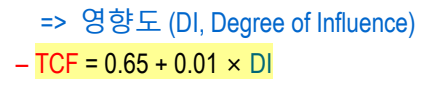 - 영향도(DI; Degree of Influence): 14개의 factor들 각각에 대하여 0(not present/no influence) ~ 5(string influence)의 가중치 값을 부여한 후, 14 factor들의 가중치 값을 더한다.