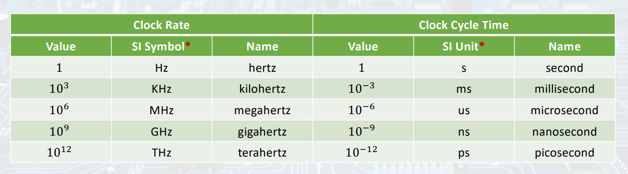 - Clock frequency (rate): Cycle per second.