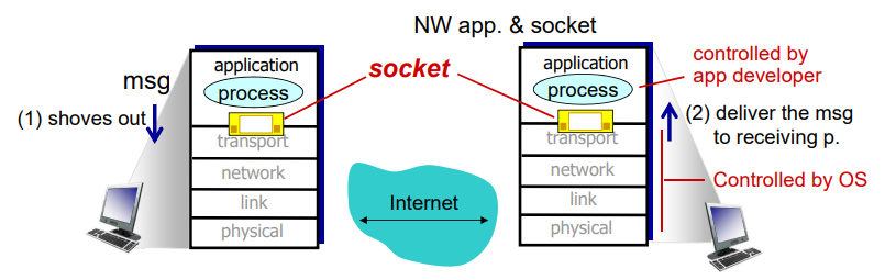- 소켓(socket): 애플리케이션 계층과 트랜스포트 계층 간의 인터페이스
