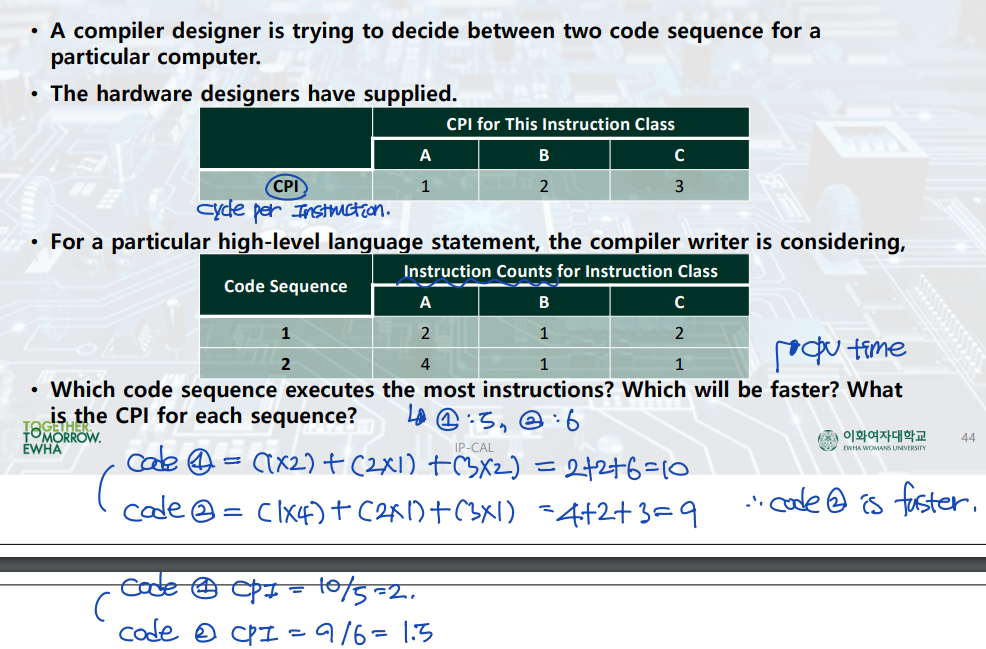 ▶ CPI: 하나의 instruction을 실행하는데 걸리는 clock cycle 수