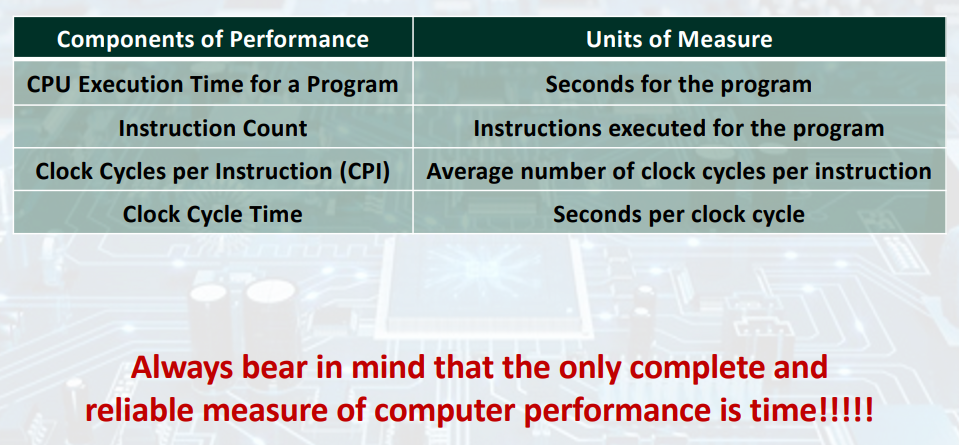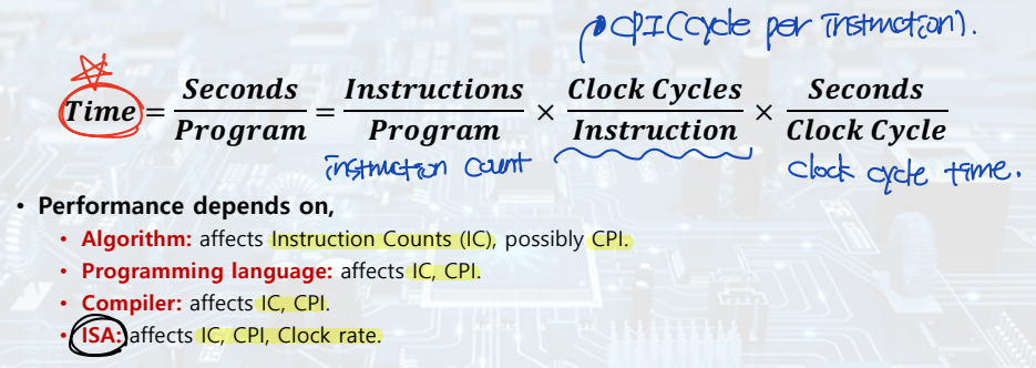 - CPU Time = Instruction Count x CPI x Clock Cycle Time