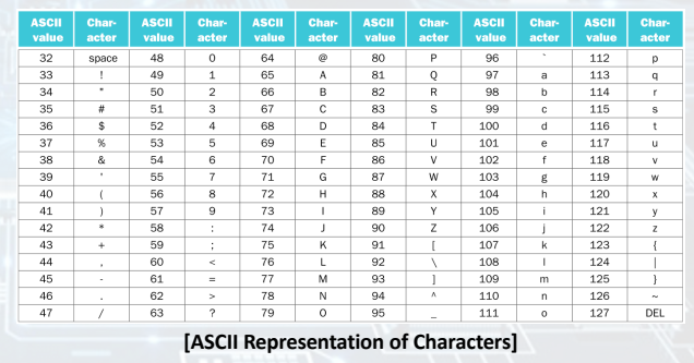- ASCII: 128 characters