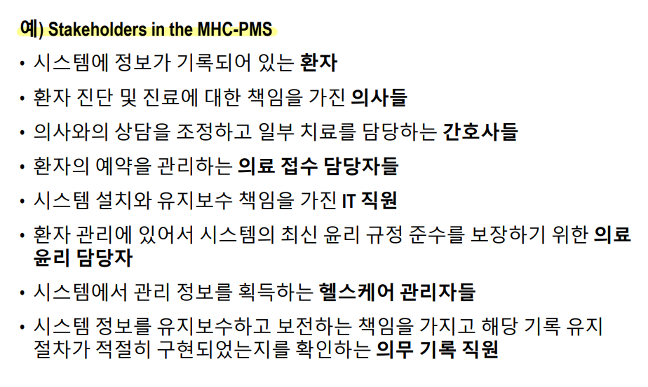 - 최종 사용자, 관리자, 유지보수와 관련된 엔지니어, 도메인 전문가, 노동조합 등이 포함될 수 있다. (이해관계자)
