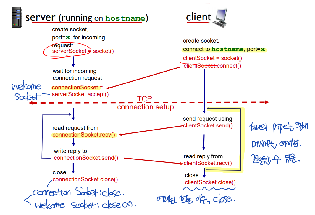 - When client create socket, client TCP establishes connection to server TCP. (welcome socket에 connect)