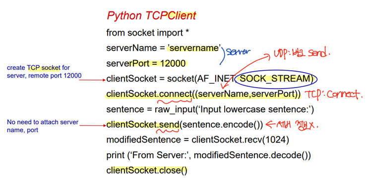 - clientSocket.send(sentence.encode()) -- 이제 서버 정보를 포함하지 않아도 된다. - Client socket close.