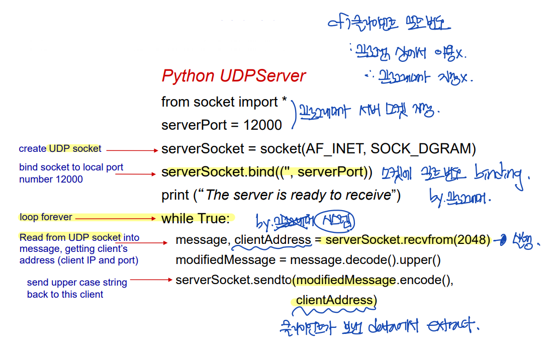 - message, clientAddress = serverSocket.recfrom(2048) -- client가 보내는 메시지에는 client의 주소가 포함된다.
