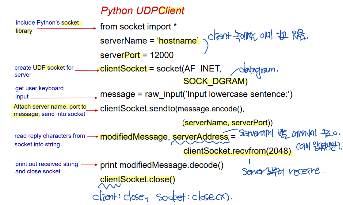 - modifiedMessage, serverAddress = clientSocket.recvfrom(2048) -- server가 reply를 보낼 때, server의 주소를 포함한다. - Print out received string and close socket.
