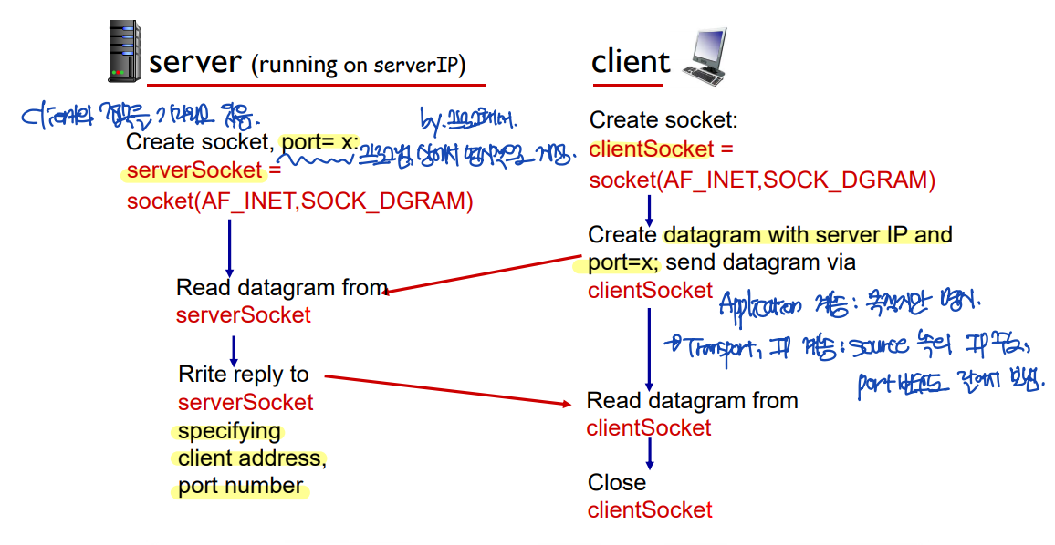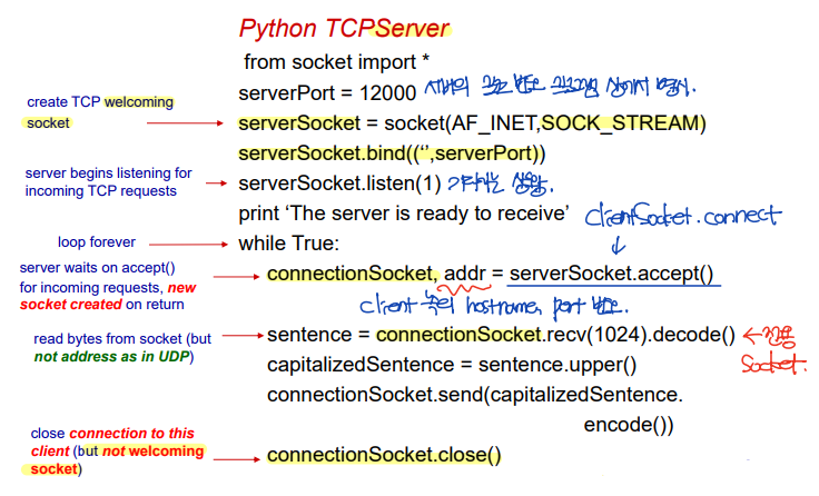- sentence = connectionSocket.recv(1024).decode() -- 전용 server에서 정보를 읽는다. 이때, 주소는 읽을 필요가 없다. - Close connection to this client (but not welcoming socket).