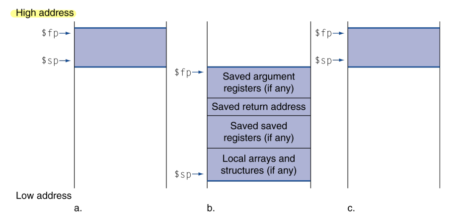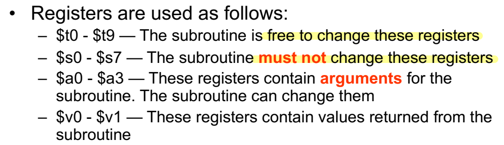 - Place parameters(매개변수) in registers. --> $a0, $a1, $a2...