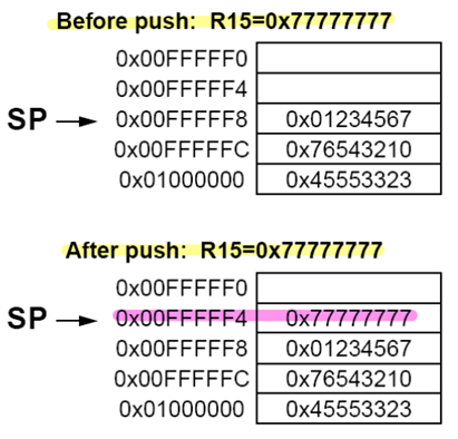 - Push 연산을 수행할 때, 현재 주소보다 4 byte만큼 낮은 주소로 push하고, 메모리의 $sp를 4만큼 줄여서, 스택포인터가 push한 데이터를 가리키도록 한다.