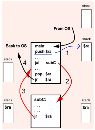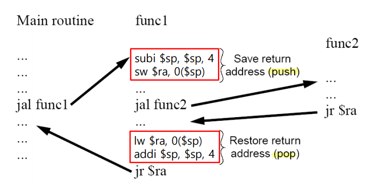 : $ra의 값을 stack에 저장하고, 필요할 때 꺼내 쓴다.