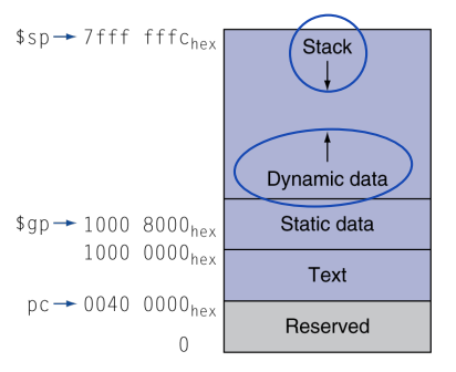 2. Can you draw the memory layout and specify what kind of data is stored at which area?