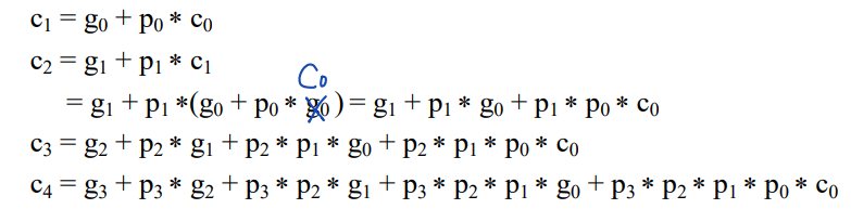 c0가 도착한 후 위의 p, g를 이용하여 c1, c2, c3, c4를 동시에 계산 (2 gate delay)하면,