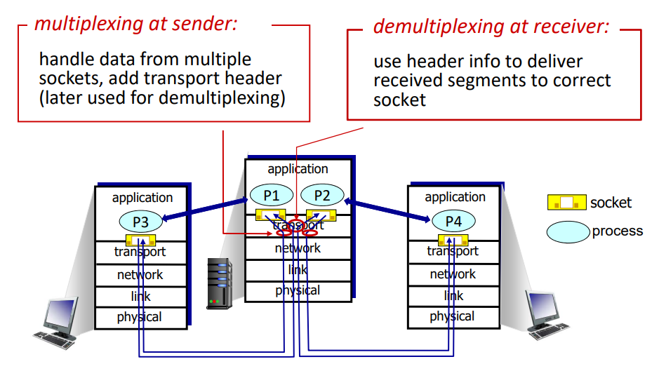 - 수신 측: 물리 --> 데이터 링크 --> 네트워크 --> 트랜스포트 --> 애플리케이션 ----- 역다중화(demultiplexing)