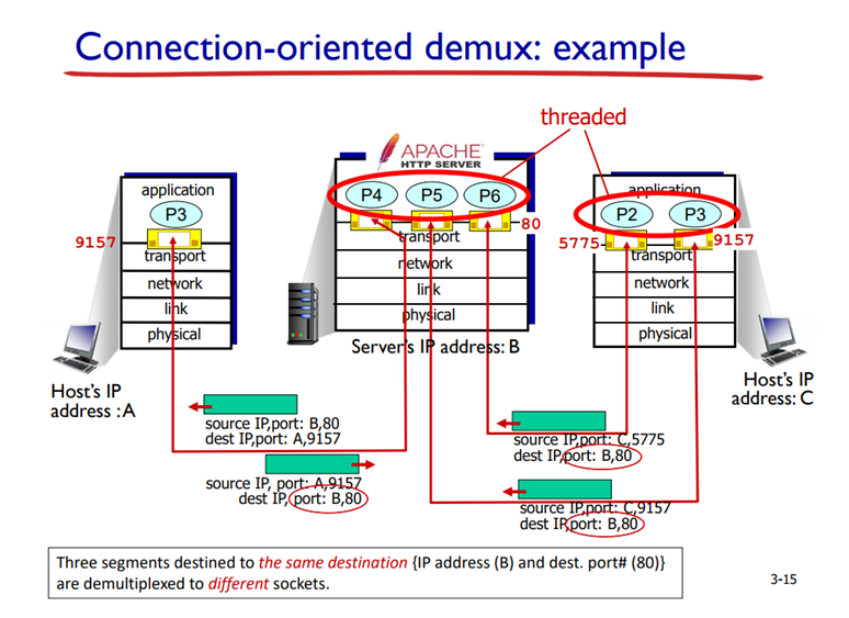 따라서 네트워크로부터 호스트에 TCP 세그먼트가 도착하면, 호스트는 해당되는 소켓으로 세그먼트를 전달(역다중화)하기 위해 4개의 값을 모두 사용한다. 특히, UDP와는 달리, 다른 출발지 주소 또는 다른 출발지 포트 번호를 가지고 도착하는 2개의 TCP 세그먼트는 2개의 다른 소켓으로 향하게 된다.
