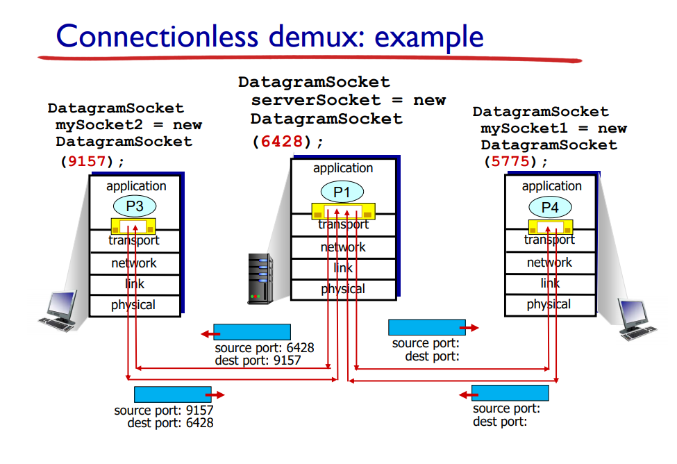 - 이제 이 세그먼트가 수신 호스트 B에 도착하면, 수신 호스트는 세그먼트 안의 목적지 포트 번호(6428)을 검사하고, 그 세그먼트를 포트 6428로 식별되는 소켓에 전달한다.