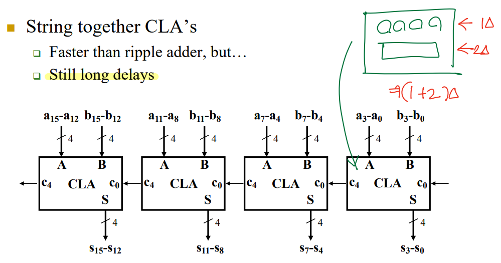 : 4-bit 단위로 gi, pi 계산 (1 gate delay) + C0가 도착한 후 gi, pi를 이용하여 C1~C4 동시에 계산 (2 gate delay) - Total delay = 3*(32/4) gate delays = 24 gate delays