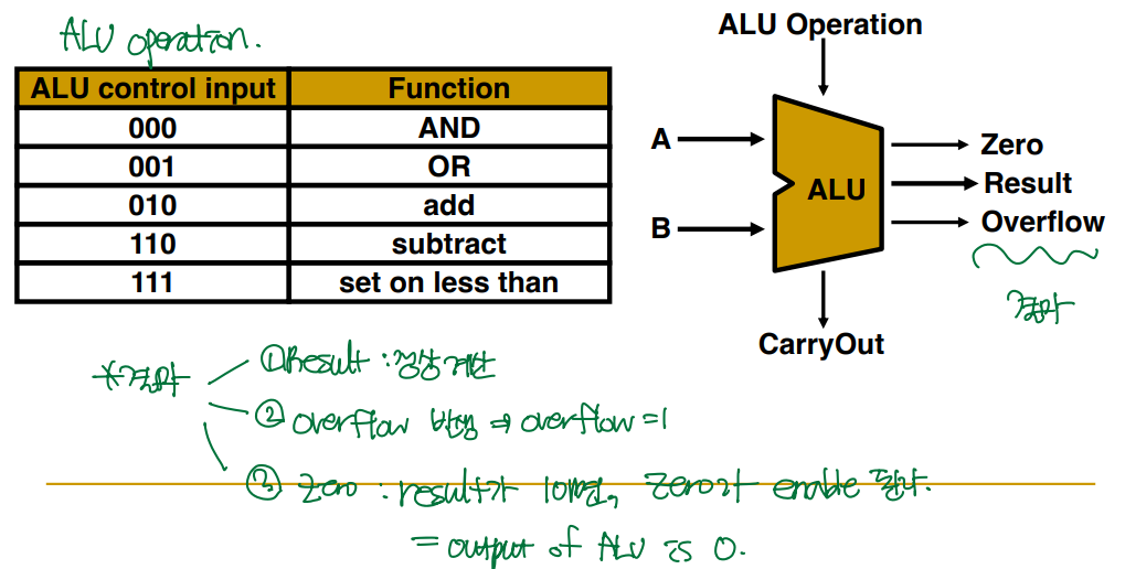 - ALU Operation (ALU control input): 어떤 연산을 할 지 결정하는 bit