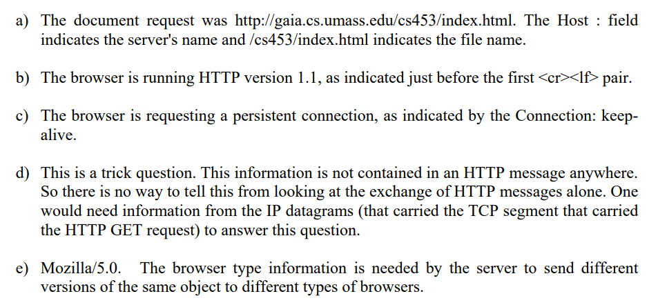 P4. 다음은 브라우저가 HTTP GET 메시지를 보내는 화면을 와이어샤크로 캡처한 ASCII 문자열이다즉, HTTP GET 메시지의 실제 내용이다.) 문자는 캐리지 리턴과 라인 피드 문자다(즉, 아래 문자 텍스트의 이탤릭체 문자열 은 HTTP 헤더 의 해당 위치에 포함된 캐리지 리턴 문자를 나타낸다). 아래 HTTP GET 메시지에서 답이 있는 곳에 표시를 하여 다음 질문에 답하라.