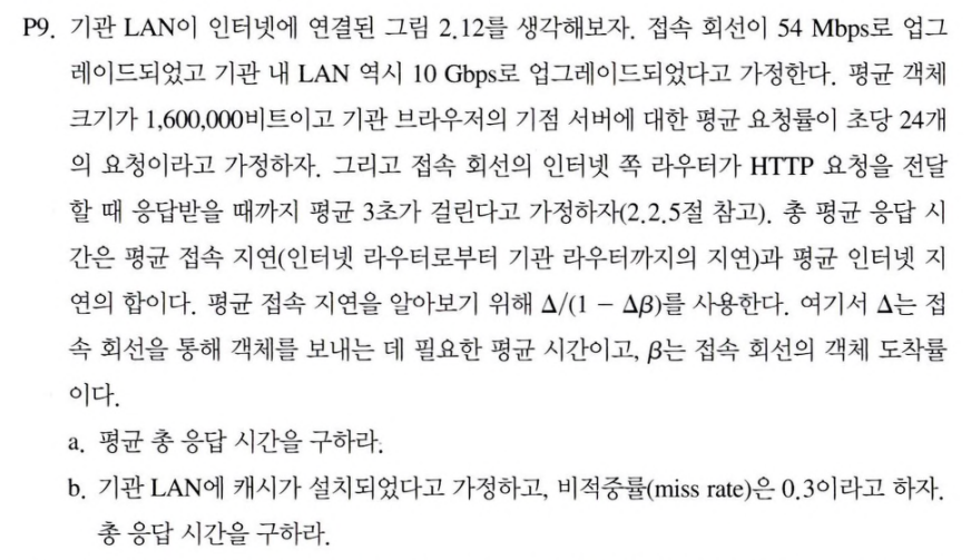 P20. 그림 2.12와 그림 2.13의 시나리오에서 기업 네트워크의 전송률은 Rl이고 병목 링크의 전송률은 Rb다. HTTP를 사용해서 크기 L인 파일을 동시에 요청하는 N개의 클라이언트가 있다고 하자. 기업 네트워크에 프록시가 설치되어 있을 때 어떤 Rl 값에 대해 파일 전송 시간이 더 작아지는가? (클라이언트와 기 업 네트워크 내 다른 호스트 간의 RTT는 무시할 수 있다고 가정한다.)