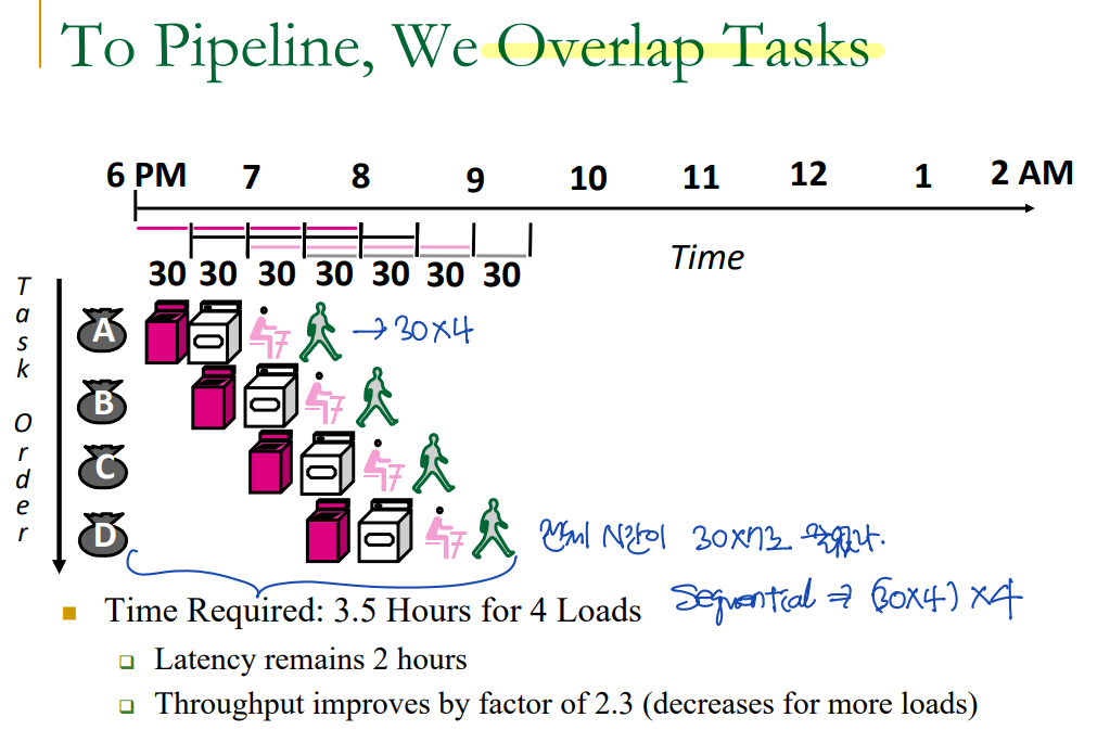 - Pipelining은 각 명령어의 실행을 끝내는 데 걸리는 시간(지연 시간; latency, execution time)을 단축시키지는 않는다. Pipelining은 명령어의 처리율(throughput)을 향상시킨다.