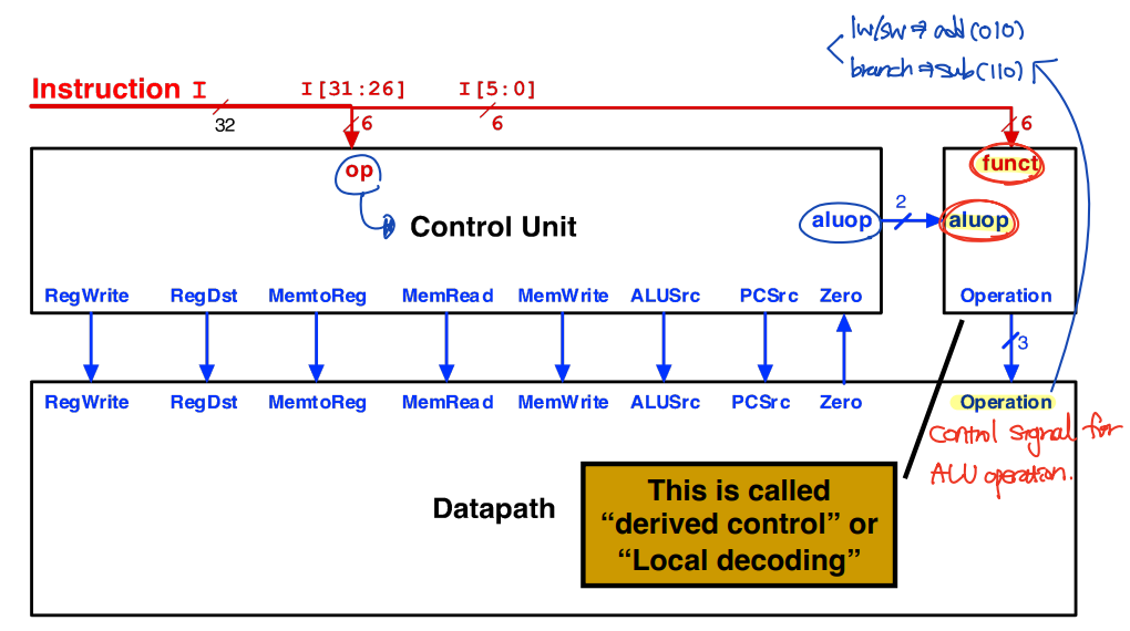: 2비트 제어 필드(ALUop), 6비트 funct 필드를 사용하여 ALU operation을 만든다. (decomposing)
