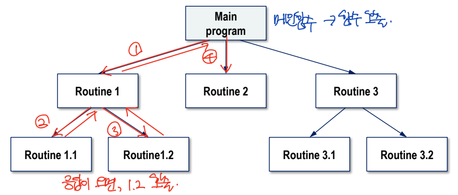 : 제어가 서브루틴 계층의 맨 위에서 시작해서 아래로 이동하는 하향식 서브루틴 모델 (순차 시스템)