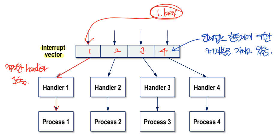 - 인터럽트 벡터는 인터럽트 핸들러에 대한 테이블을 가지고 있고, 인터럽트가 발생하면 적절한 handler를 호출한다.