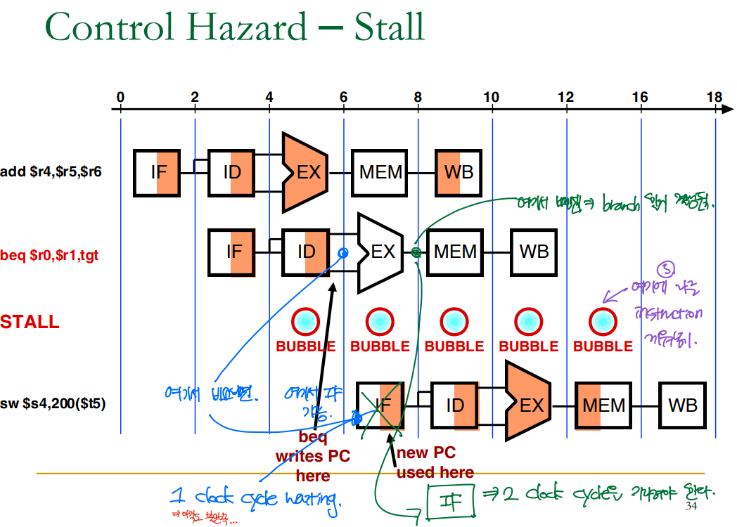 - Branch 연산의 경우, ALU에서 subtraction이 완료되어 Zero control이 1이 되어야, branch를 결정할 수 있음. Branch를 결정하면, memory에서 instruction fetch를 해야 하기 때문에 IF stage임. (Control hazard)