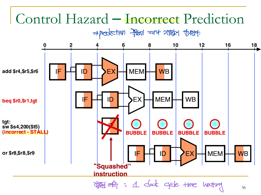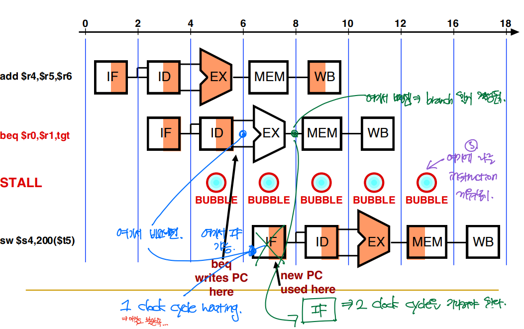 원래는 ALU stage에서 subtraction을 통해 두 레지스터 값을 비교하고, Zero control이 1인지 0인지에 대한 판단이 끝나야 새로운 PC 값을 설정하는 IF 단계를 수행할 수 있다. 그렇다면, 2 clock cycle waiting이 필요해진다.