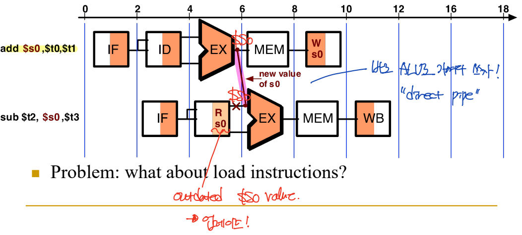 - Direct pipe: ($t0 + $t1) 값을 $s0에 WB하기 전에, ALU 단계를 마친 후 바로 그 값을 sub의 ALU stage로 가져온다.