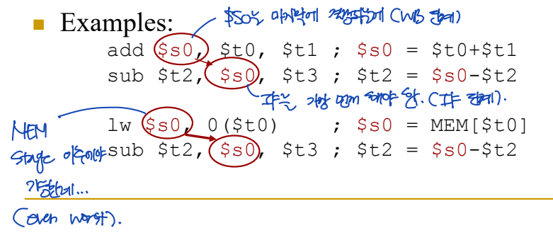예) branch - ALU stage에서 subtraction이 완료되어야, branch 여부를 판단할 수 있다.