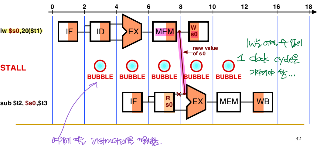 lw에서는 ALU에서 연산한 후, 메모리에 접근하여 memory read 후, 그 값을 $s0에 저장해야 한다. 따라서 MEM 단계 이후에 sub의 ALU 연산을 할 수 있다. --> 1 clock cycle waiting은 불가피하다.