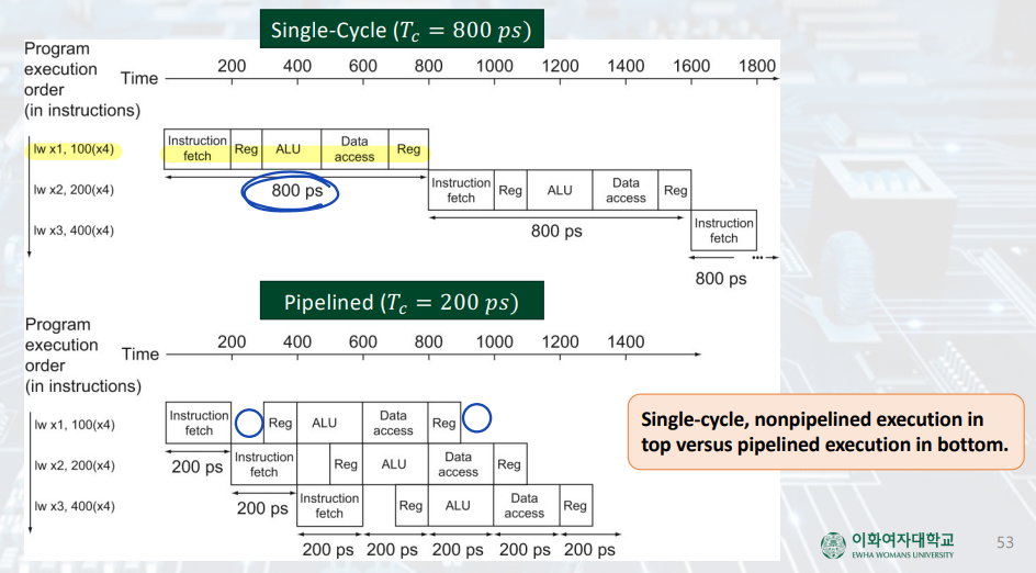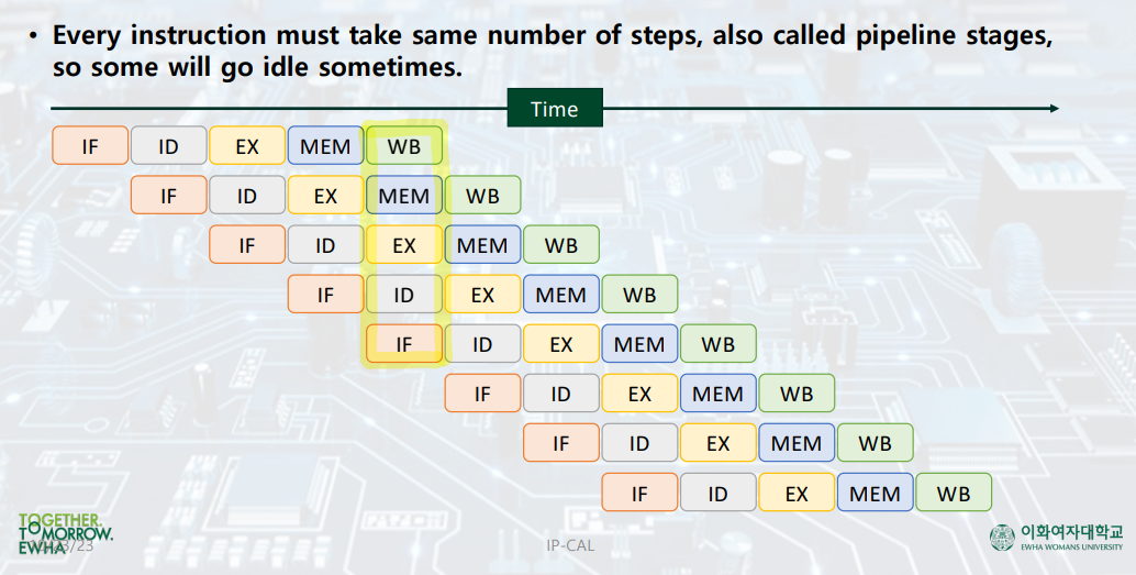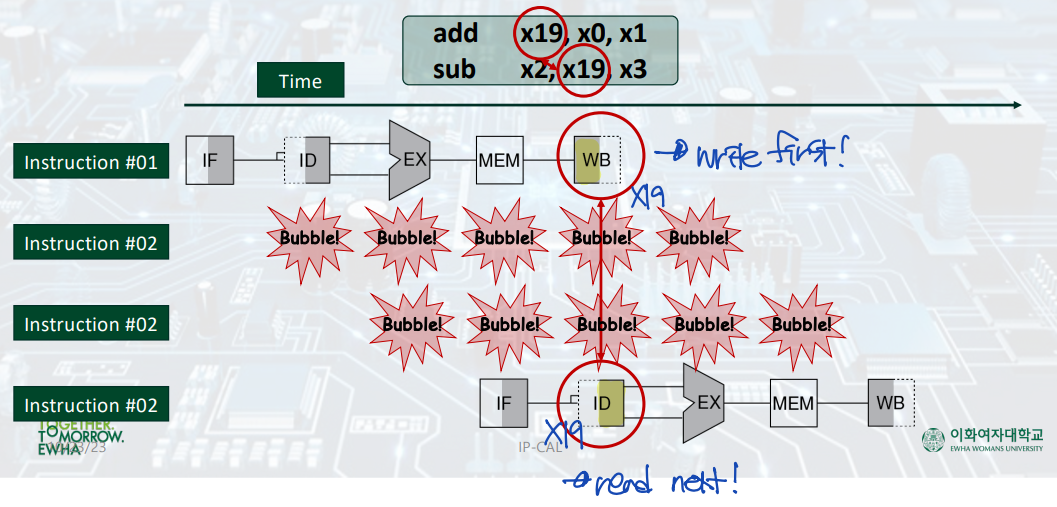 예) WB, ID 동시에 - Data hazard: Need to wait for previous instruction to complete its data read/write.