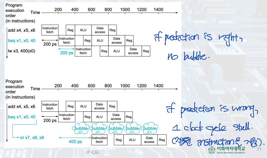 : Branch 할 지 여부를 결정하고 난 후 (EX 단계), 그 다음 instruction의 수행 여부를 결정할 수 있다. --> 1 bubble